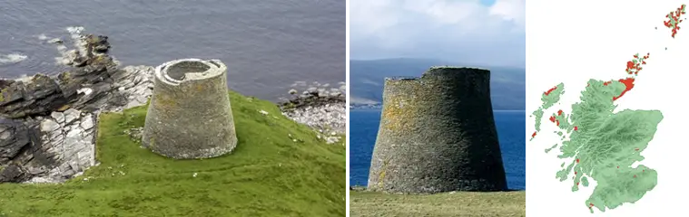 Брох Муса на Шетландских островах. Брохи — это разновидность круглых домов железного века, встречающихся только в Северной Шотландии, и Муса — наиболее хорошо сохранившийся из них. Считается, что он был построен около 300 года до нашей эры, его высота составляет 13 метров, и он является символом шотландской кельтской эпохи. Этот брох упоминается дважды в скандинавских сагах. Назначение брохов и их культурная принадлежность являются предметом споров. На фото справа: карта распространения брохов в Шотландии (выделено красным).[/size