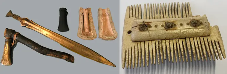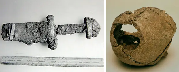 Курган в Баллатере (Ballateare), раскопанный в 1946 году Герхардом Берсу на острове Мэн, является значимым памятником Эпохи викингов (около 900 г.), представляющий собой гроб с телом воина-мужчины, в котором находятся обломки оружия и ритуально принесенное в жертву тело женщины, увенчанное кремированными костями животных. На фото слева: меч, намеренно разбитый на три части. На фото справа: череп принадлежащий женщине, принесенной в жертву, чтобы сопровождать воина в загробной жизни