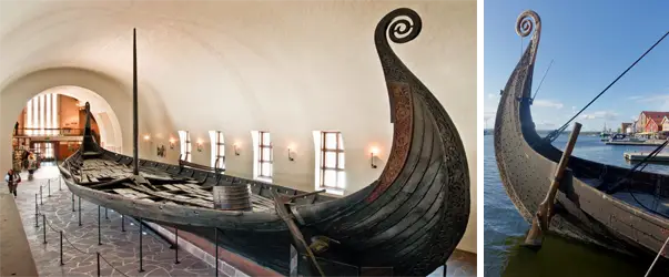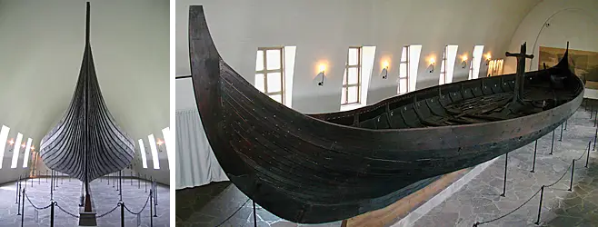 На фото слева: знаменитый норвежский корабль викингов, клинкерный корабль из Осеберга (названный в честь места находки). Радиоуглеродный анализ и анализ годичных колец деревьев показывают, что этот корабль с дубовым корпусом был возведен около 820 года нашей эры и извлечен из-под завалов в 1904 году. Находится в Зале викингских кораблей в Осло, в Музее культурной истории. На фото справа: реплика корабля из Осеберга
