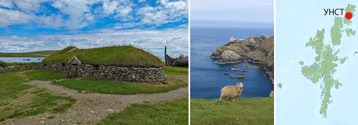 Остров Унст — самый северный обитаемый остров Шотландии — один из самых живописных, разнообразных и обитаемых островов и третий по величине остров Шетландского архипелага. На этом острове обнаружена самая высокая из известных на сегодняшний день концентраций сельских поселений викингов. Здесь находится копия реконструированного «длинного дома» викингов и полномасштабная реконструкция корабля из Гокстада
