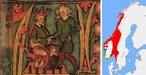 На изображении слева: Харальд Прекрасноволосый (справа) получает трон Норвегии от своего отца. Иллюстрация из крупнейшей средневековой исландской рукописи «Флатейярбок» (Codex Flateyensis) XIV века. На изображении справа: Норвегия в первом десятилетии 800-х годов