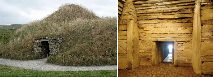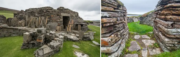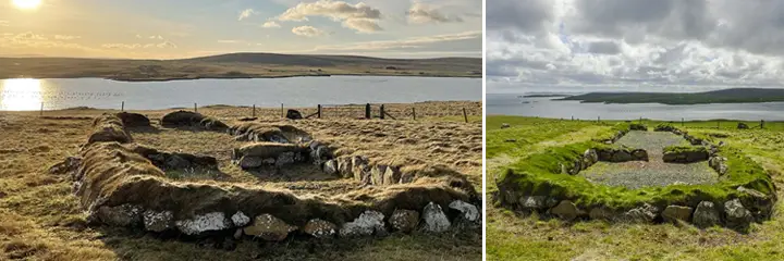 До прихода викингов коренные жители Оркнейских и Шетландских островов строили круглые дома, разделенные на «комнаты», образуя то, что мы называем «домами-колесами», потому что сверху они напоминают колесо повозки, где центральный очаг служил ступицей колеса.