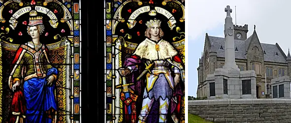 Фото слева: витраж с изображением принцессы Маргарет и Якова III Шотландских в ратуше Леруика. Судя по всему, они изображены отвернутыми друг от друга, поскольку их брак был недолгим и несчастливым! Фото справа: ратуша города Леруика