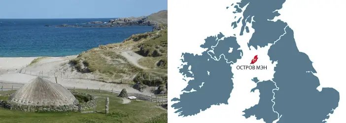 Низкие песчаные северо-западные берега острова Мэн обеспечивают удобный подход для плоскодонных лодок и являются одними из лучших мест для высадки и викинги не только высадились на этом северном побережье, но и поселились здесь. На фото слева: реконструкция деревни викингов на острове Мэн. На фото справа: расположение острова в Ирландском море