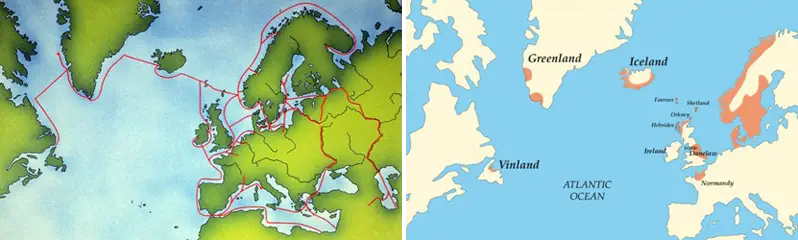 География Эпохи викингов. На изображениях можно увидеть морские пути, которые соединяли побережья и людей в эпоху викингов, а так же их постоянные поселения. В IX веке были открыты новые морские пути, следуя которым парусные корабли позволили достигать миров, далеких от привычных берегов Скандинавии. В узловых точках морских путей возникали сложные новые культуры, города, сети и сообщества, а торговля процветала. Глядя на эту Эпоху, можно с уверенностью сказать, что мореплавание викингов преобразило мир
