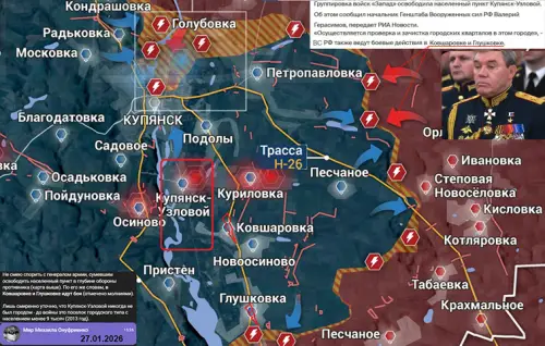 Российские войска с начала января освободили от войск киевского режима 17 населенных пунктов, в том числе Купянск-Узловой. По самому Купянску ситуация сложная, но наши войска продолжают зачистку городских кварталов от украинских формирований, сумевших проникнуть в город, под Купянском заблокированы несколько подразделений ВСУ общим количеством не менее 800 человек, сейчас идет их уничтожение.