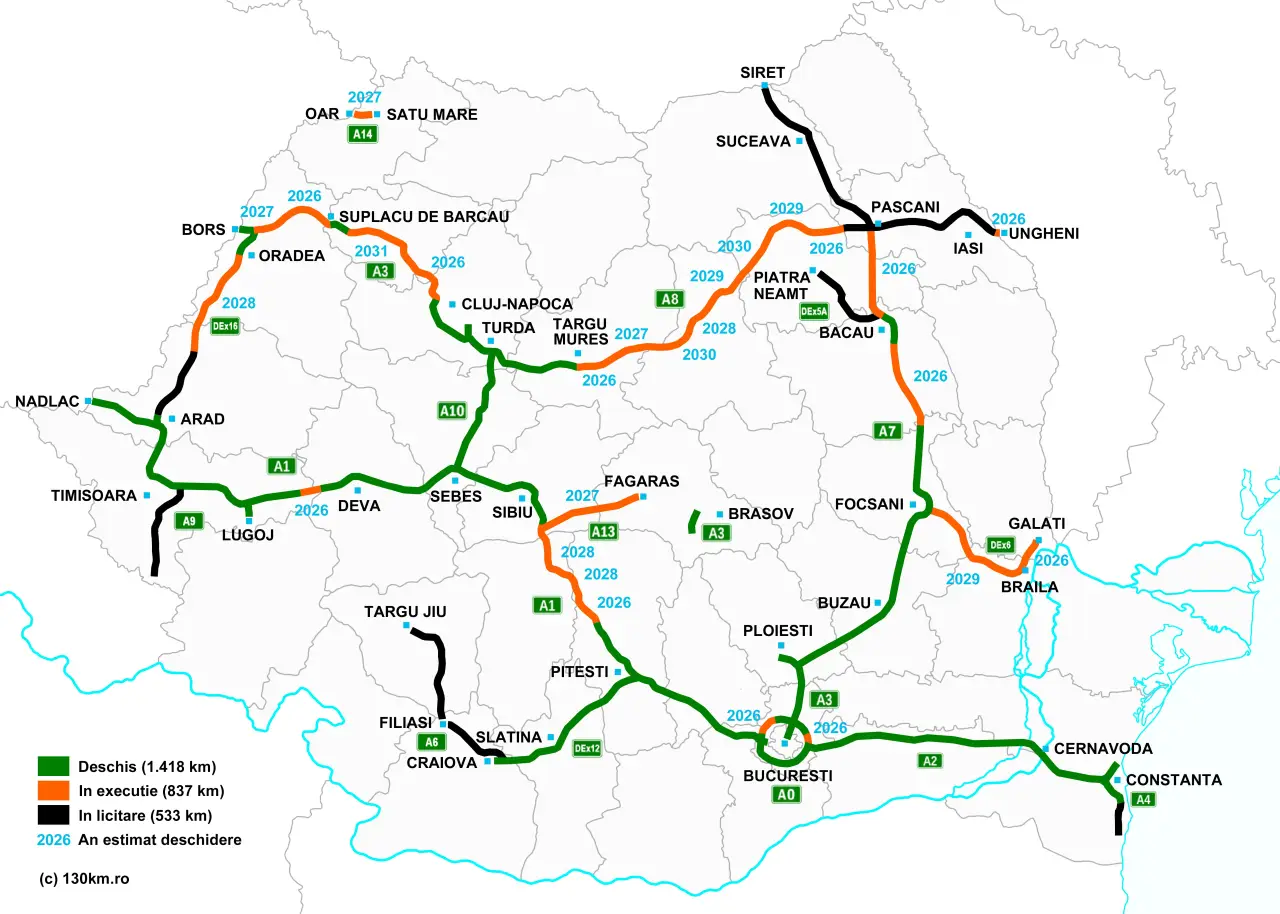 Шоссе в Румынии (зелёный цвет – в эксплуатации, оранжевый – в частичной эксплуатации, чёрный – в планах постройки):