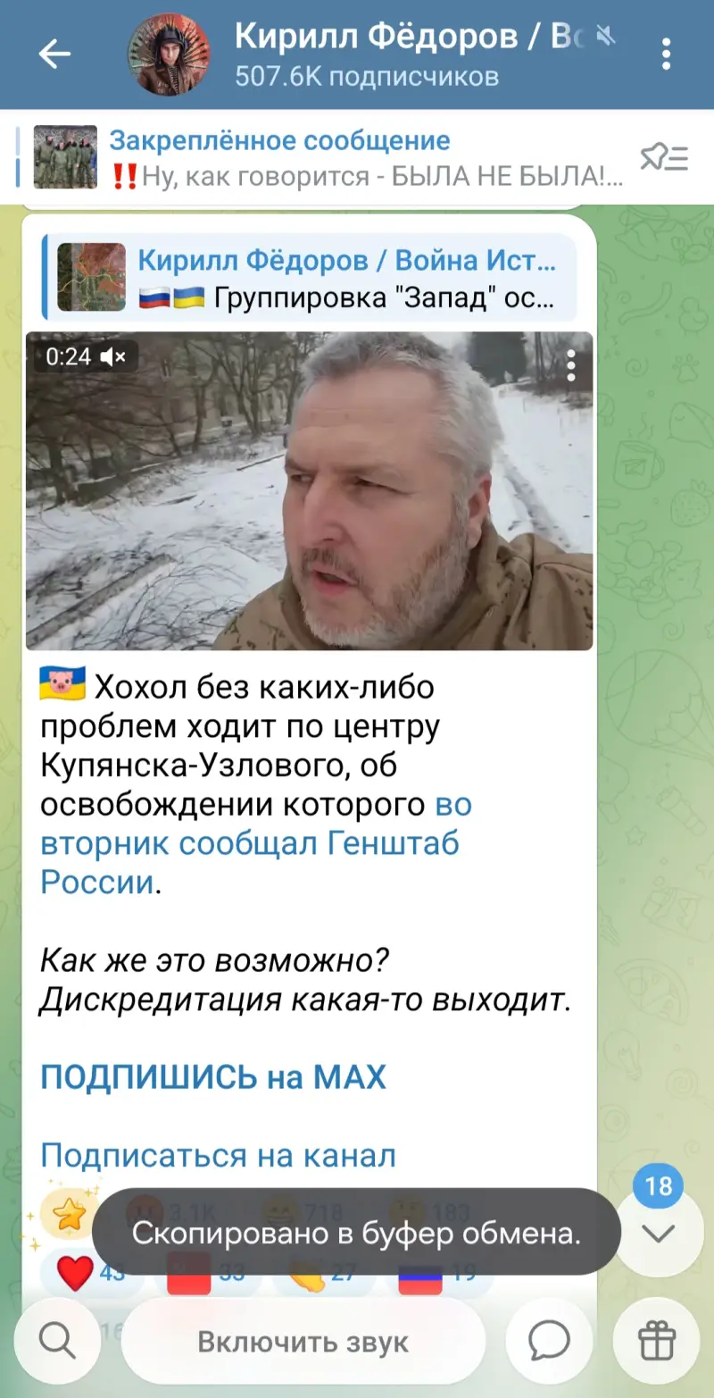 Сложной продолжает оставаться ситуация в районе Купянска. Несмотря на нашумевший доклад главы Генштаба Валерия Герасимова об освобождении Купянска-Узлового, на большинстве транслируемых в сети интерактивных карт «красного» закраса у Купянска-Узлового нет. Противник считает, что ГШ ВС РФ на фоне подготовки к новому раунду переговоров занимается «введением в заблуждение», чтобы в случае «обмена территориями» якобы обменять то, что «армия России не контролирует».