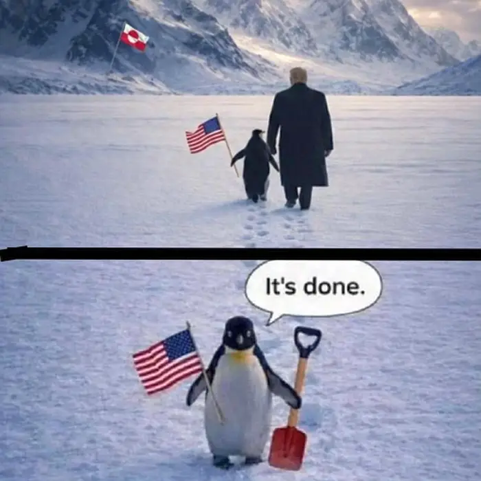В подписи к сгенерированному ИИ снимку говорится: «Обнимите пингвина». Этих нелетающих морских птиц в Гренландии отродясь не водилось. Наверное, Трамп намеревается завести их из Южного полушария, когда заполучит контроль над островом.