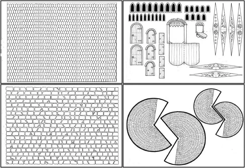 Детали макета замка для распечатки. Слева: черепица и кладка. Справа: окна, ворота, флаги, черепичные крыши. При распечатке на принтере их можно залить любым желаемым цветом