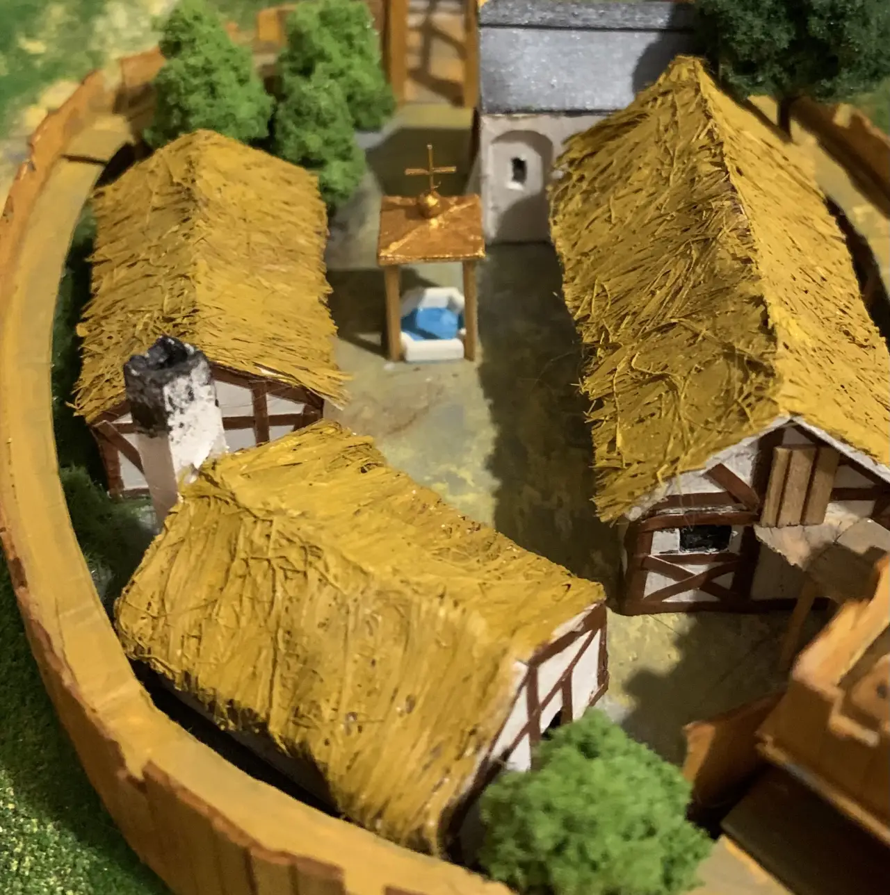 Макеты домиков: казарма, конюшня, кузница и церковь в романском стиле. «Соломенные крыши» из… набора льняной пряжи для герметизации труб