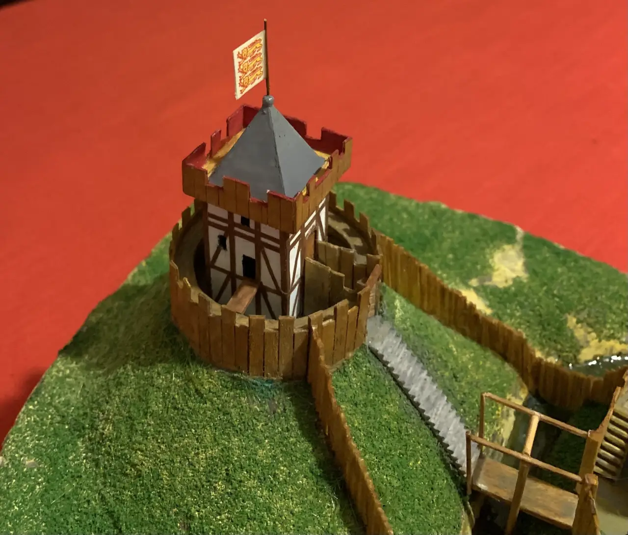 Замок «мотт и бейли» в работе. Установлен донжон, окружающая его стена, лестница, стена бейли с бойницами, мост и воротная башня. Колья у протоки, ведущей в ров, из кончиков китайских зубочисток