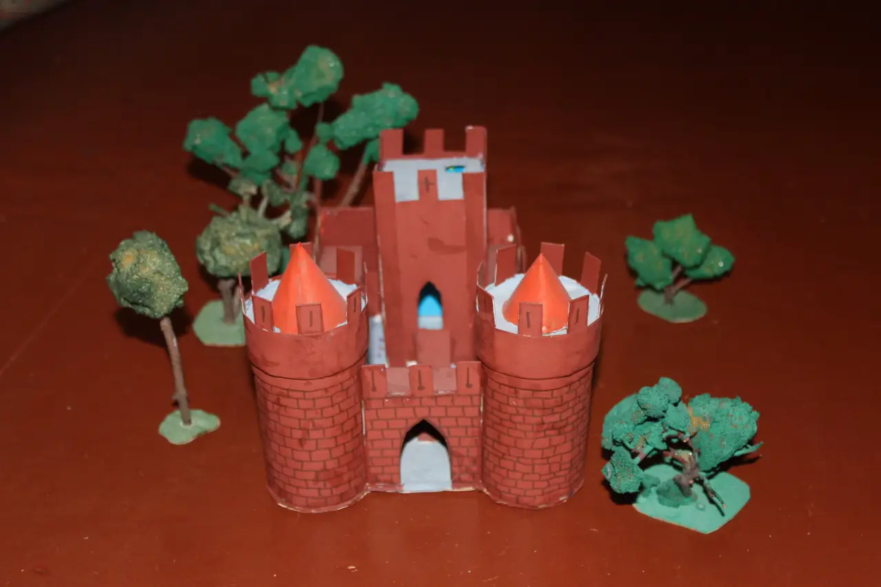 Макет средневекового рыцарского замка, склеенный из набора бумажных разверток. Находится в пензенской школе № 47. Фотография автора