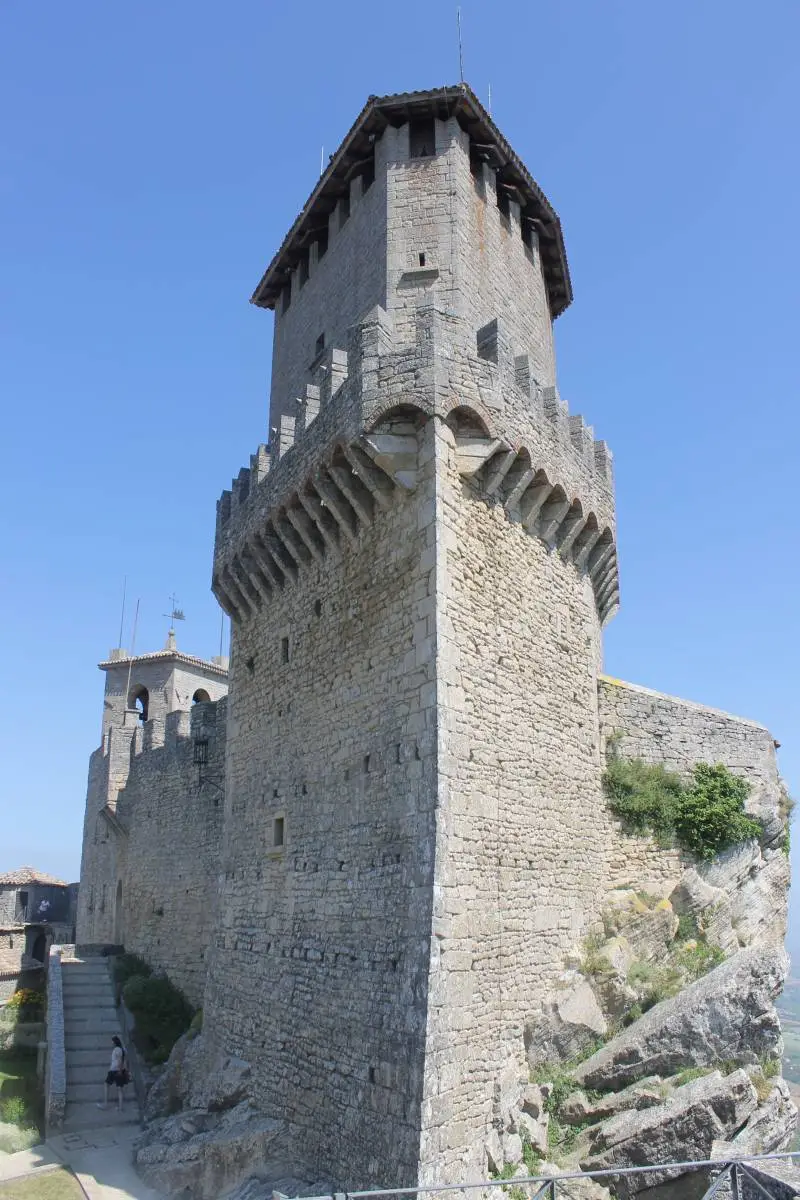 Башня Гуаита одного из замков Сан-Марино имеет необычную клиновидную форму. Хорошо видны ряды машикулей
