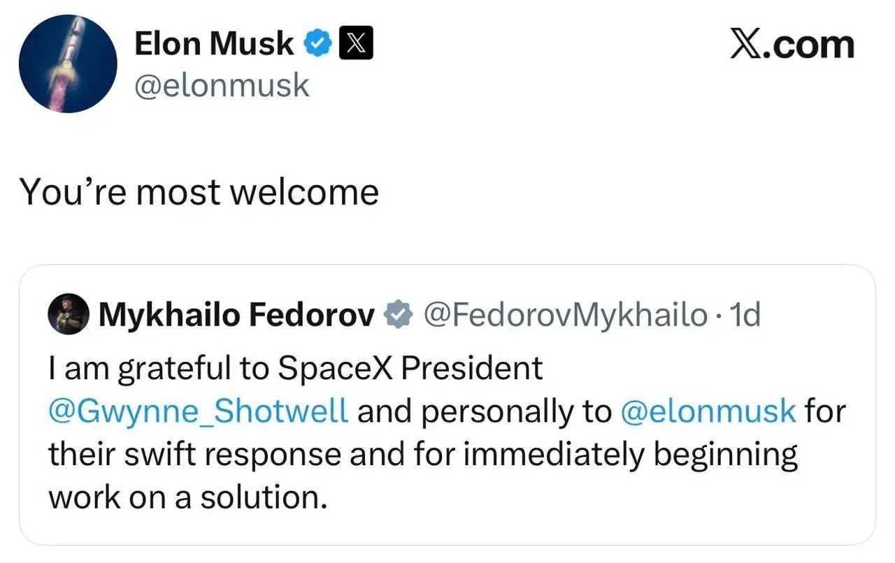 При этом Федоров зачем-то опубликовал в своем аккаунте соцсети Маска заочные слова благодарности за помощь, которой еще нет, в решении проблемы использования ВС РФ Starlink.