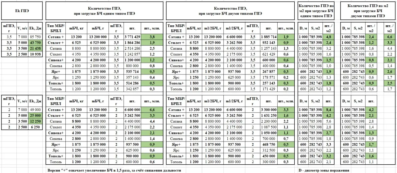 Примерный расчёт шрапнельных БЧ для различных МБР