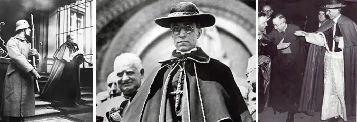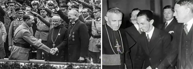 На фото справа: подписание Рейхсконкордата 20 июля 1933 года в Риме. Слева направо: прелат Людвиг Каас, вице-канцлер Франц фон Папен, секретарь по церковным делам Джузеппе Пиццардо, кардинал-государственный секретарь Эудженио Пачелли, Альфредо Оттавиани и член Рейхсминистерства внутренних дел Рудольф Буттман. На фото слева: А. Гитлер и нунций Ватикана Чезаре Орсенито (январь, 1935 год)
