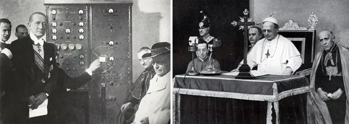 «Радио Ватикана», официальная служба радиовещания Ватикана, было основано в 1931 году Гульельмо Маркони, изобретателем радио. Радиостанция была создана по поручению Папы Пия XI с целью донести до мира голос Папы и евангельское послание. В 1936 году Международный союз электросвязи признал «Радио Ватикана» «особым случаем», разрешив ему вещание без географических ограничений. Во время Второй мировой войны новостные передачи радиостанции были запрещены в Германии, но она оставалась независимым голосом, вещая на четырех языках. Радио использовалось для распространения информации о состоянии Церкви на оккупированных территориях и поиска пропавших без вести через информационный центр Ватикана. На фото слева: мужчина слушает «Радио Ватикана». На фото справа: аппаратная «Радио Ватикана»