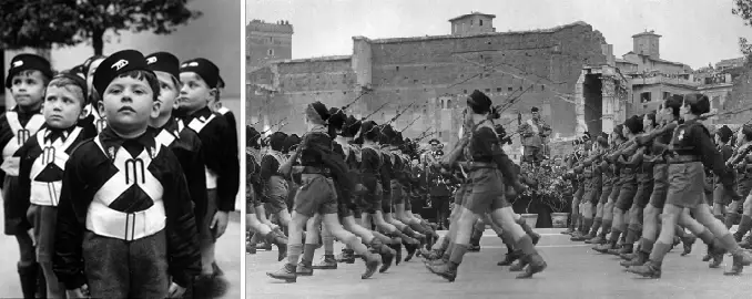 Члены фашистской молодежной организации (Opera Nazionale Balilla, ONB) маршируют мимо Бенито Муссолини во время празднования 20-й годовщины вступления Италии в Первую мировую войну, 27 мая 1935 года. Эта молодежная организация функционировала в качестве дополнения к школьному образованию в период с 1926 по 1937 год, когда она вошла в состав «Итальянского литторио» (GIL), молодежной секции Национальной фашистской партии. Источник: Encyclopaedia Britannica, Inc