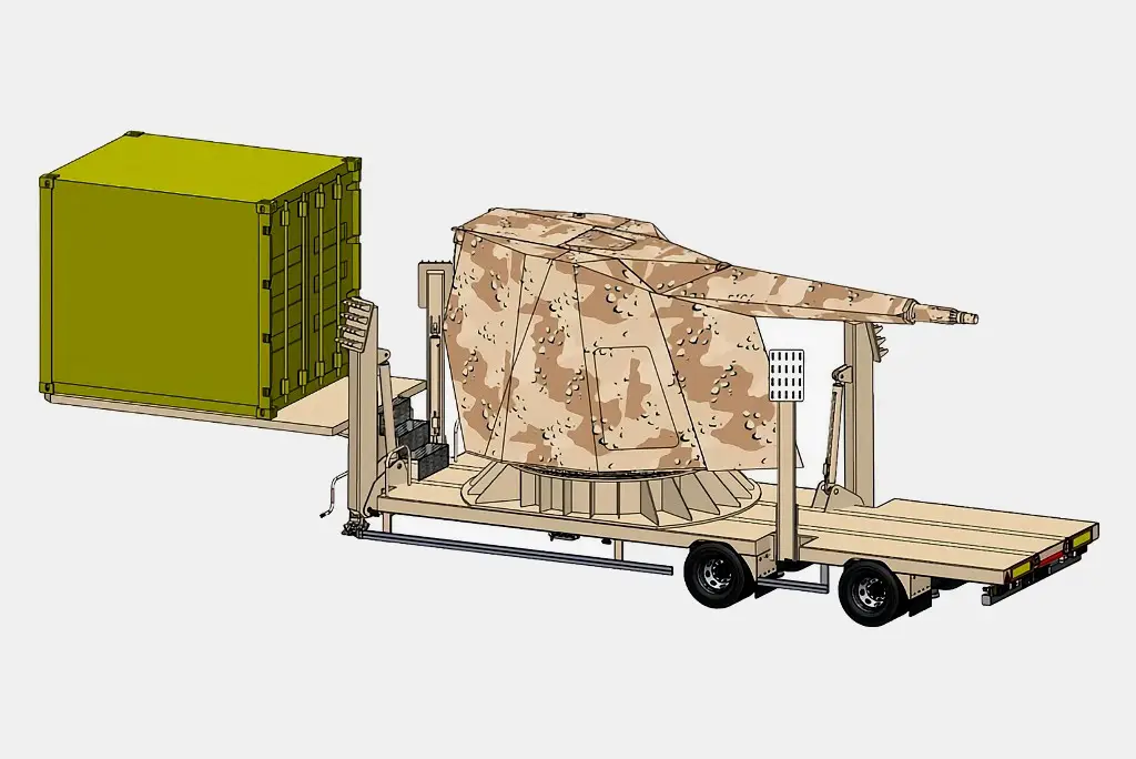 В передней части полуприцепа-платформы предлагается разместить 10-футовый контейнер с приборами управления, средствами связи и т.д. На самой платформе будет смонтирована корабельная артиллерийская установка Leonardo 76/62 SovraPonte. Также полуприцеп получит откидные домкраты для размещения на позиции.