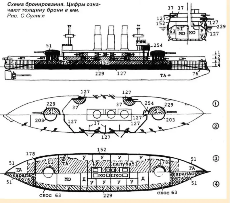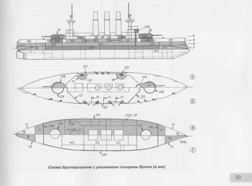 Хотя, конечно, те завалы не были столь сложными, как на «Цесаревиче», но все-таки. В то же время, если корпуса тех же «Пересветов» были проще в изготовлении, то весьма хитро изогнутая броня носовых и кормовых казематов, каковая должна была обеспечивать защиту как вдоль, так и поперек диаметральной плоскости корабля, была крайне сложным элементом конструкции.