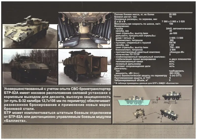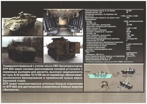В информационных материалах на стенде говорится, что БТР-22 массой 20 тонн рассчитан на экипаж из 3 чел. и десант из 8 мотострелков. Особое внимание уделяется улучшенному обзору для командира, водителя и наводчика благодаря тепловизорам и панорамной камере кругового обзора.