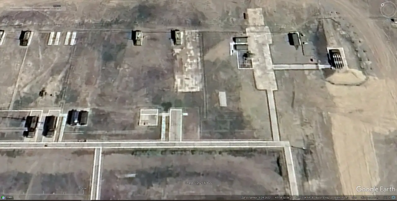 Спутниковый снимок Google Earth: СОУ 9А317Э ЗРК «Бук-М2Э», радиолокатор П-18 и другая техника на позиции западнее города Аягоз в Абайской области Казахстана. Снимок сделан в мае 2022 года