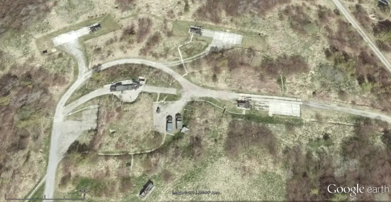 Спутниковый снимок Google Earth: ЗРК «Оса», мобильная пусковая установка ОТРК 9К72 «Эльбрус», СПУ 2П25 и СУРН 1С91 из состава ЗРК «Куб», между БТР-70 стоит ЗСУ-23-4. Позади на площадке имитаторы режимов работы СНР советских ЗРК. Снимок сделан в декабре 2016 года