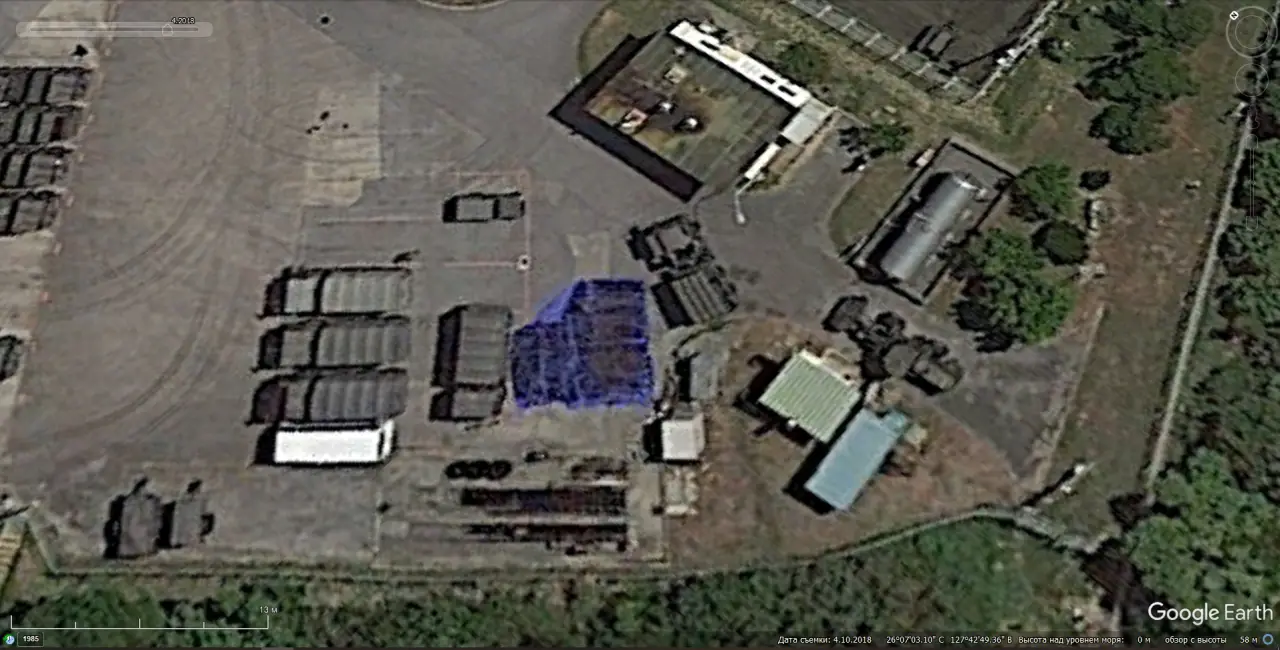 Спутниковый снимок Google Earth: СПУ 2П25 ЗРК «Куб» на британском полигоне Спейддам. Снимок сделан в июне 2018 года
