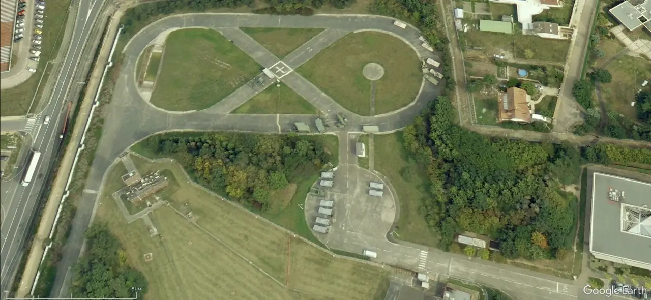 Спутниковый снимок Google Earth: ЗРК «Оса» среди других экспонатов военного музея в Дрездене. Снимок сделан в июле 2023 года