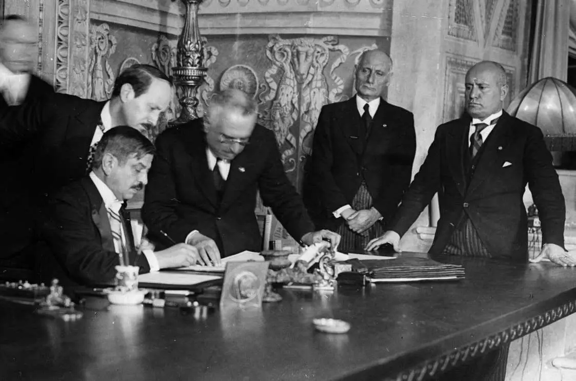 Лаваль и Муссолини за подписанием соглашения, оставшегося в истории как Римский пакт, 1935 год