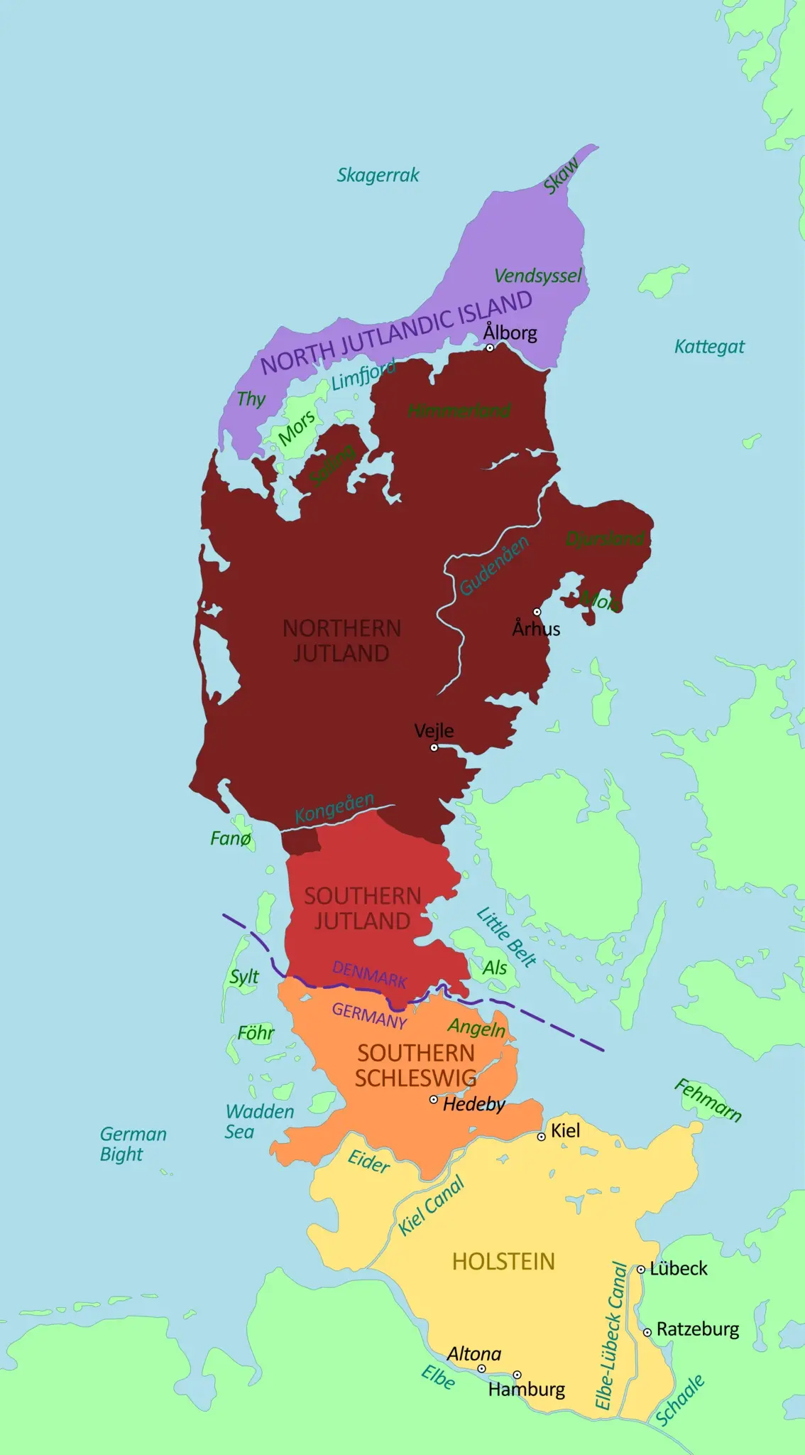 Ютландский полуостров, красным цветом окрашен Северный Шлезвиг