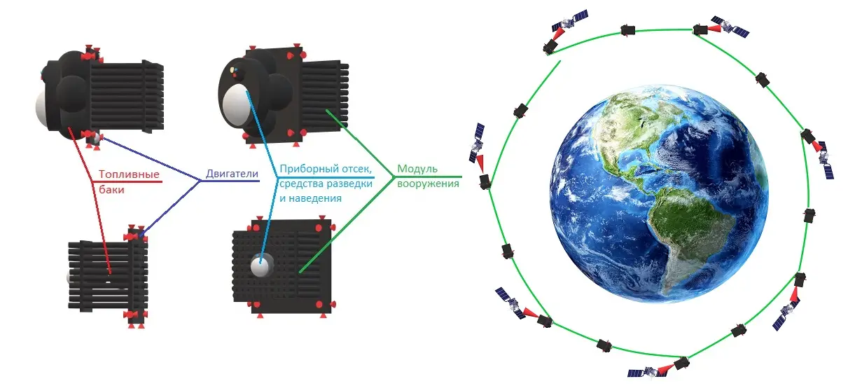 Если же разместить его на ГСО, то расстояние до спутников противника, находящихся на НОО, будет больше, чем при атаке их с поверхности Земли, да и вывести десятки тонн на ГСО — это не простая задача.