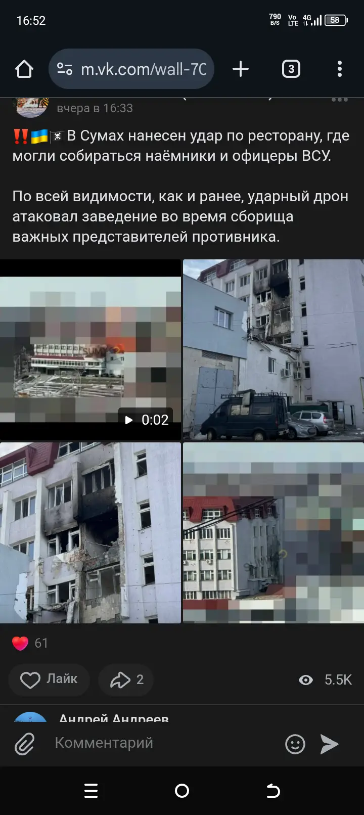 Российские каналы указывают, что накануне ВС РФ нанесли удар, предположительно, БПЛА «Герань», по ресторану развлекательного комплекса «Сан-Ремо» в Сумах, где отмечали свое прибытие в город иностранные наемники и офицеры ВСУ. После расформирования «Интернационального легиона» иностранцев одного из двух батальонов зачислили в 253-й отдельный штурмовой полк «Арей» и отправили в Сумскую область. Повоевать не успели, да и домой наверняка не все вернутся.