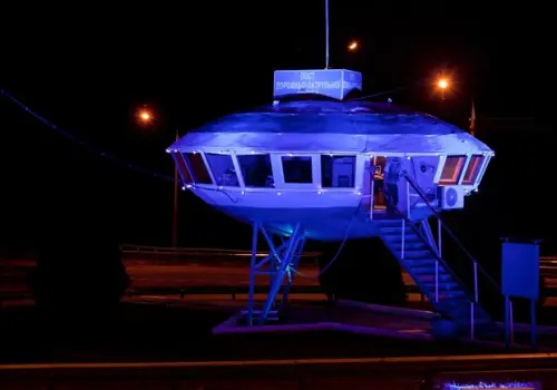 На сопке(высота 611) расположенной напротив центральной площади г. Дальнегорска,Прим.кр. установлен памятник инопланетянам в виде летающей тарелки.