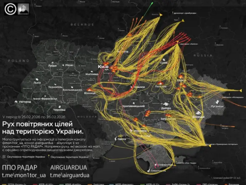 На иллюстрации к материалу представлена украинская версия прилётов ракет и дронов ночью и ранним утром четверга.
