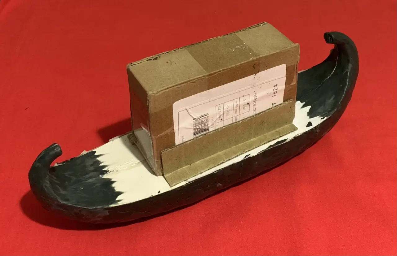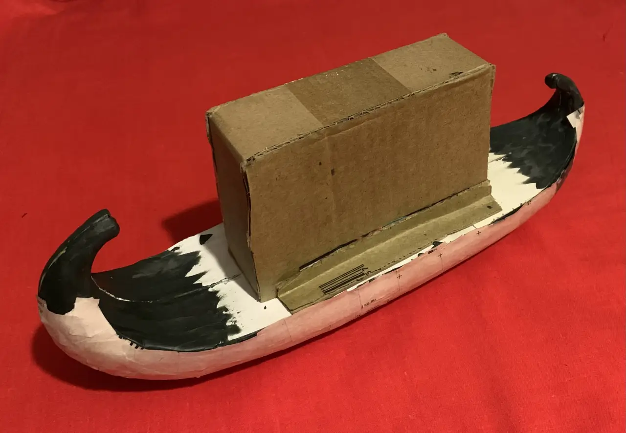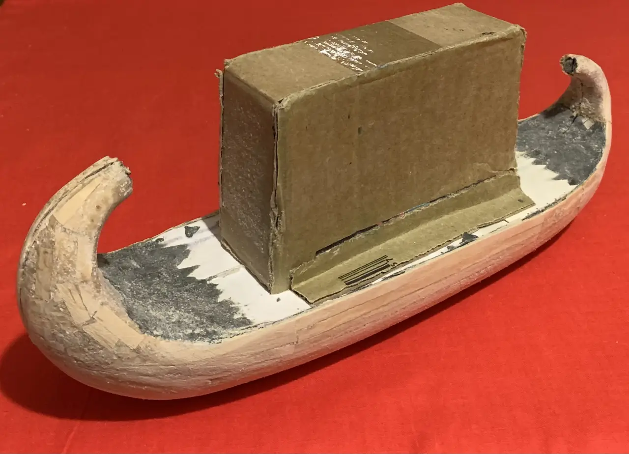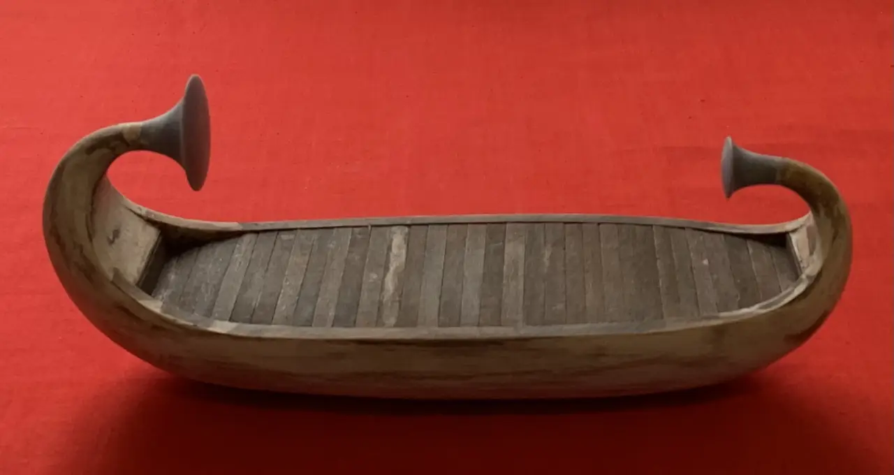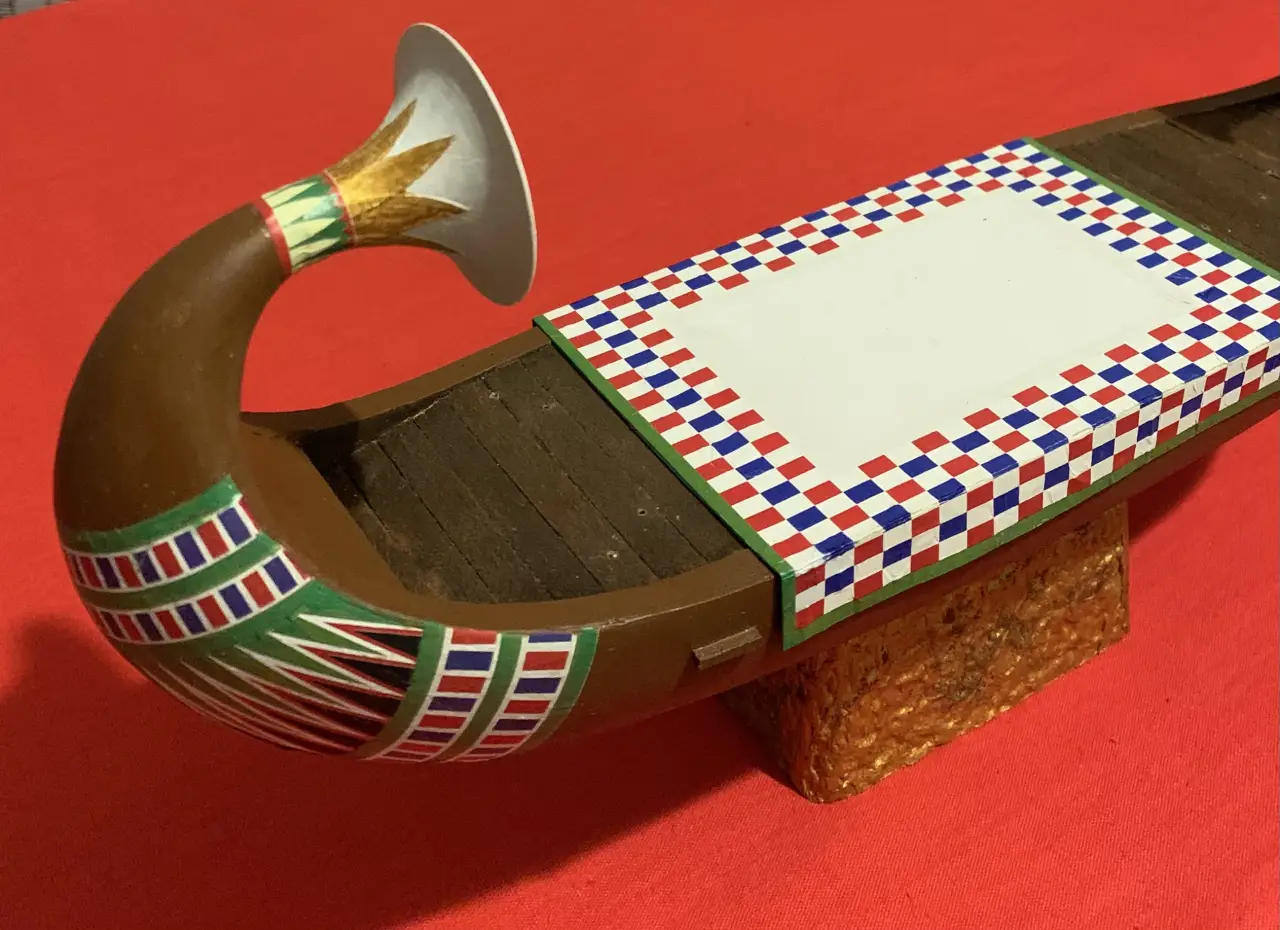 Пожалуй, можно еще одну синюю ленту повязать и на носовой завиток, а на корму поставить штандарт с изображением священного крылатого скарабея и солнечного диска – и тогда на лодке будет уже не Клеопатра, а Нефертити. Но стоит ли всё это делать, еще надо будет подумать. Равно как и решить вопрос: нужна ли сюда еще и подставка из дерева?