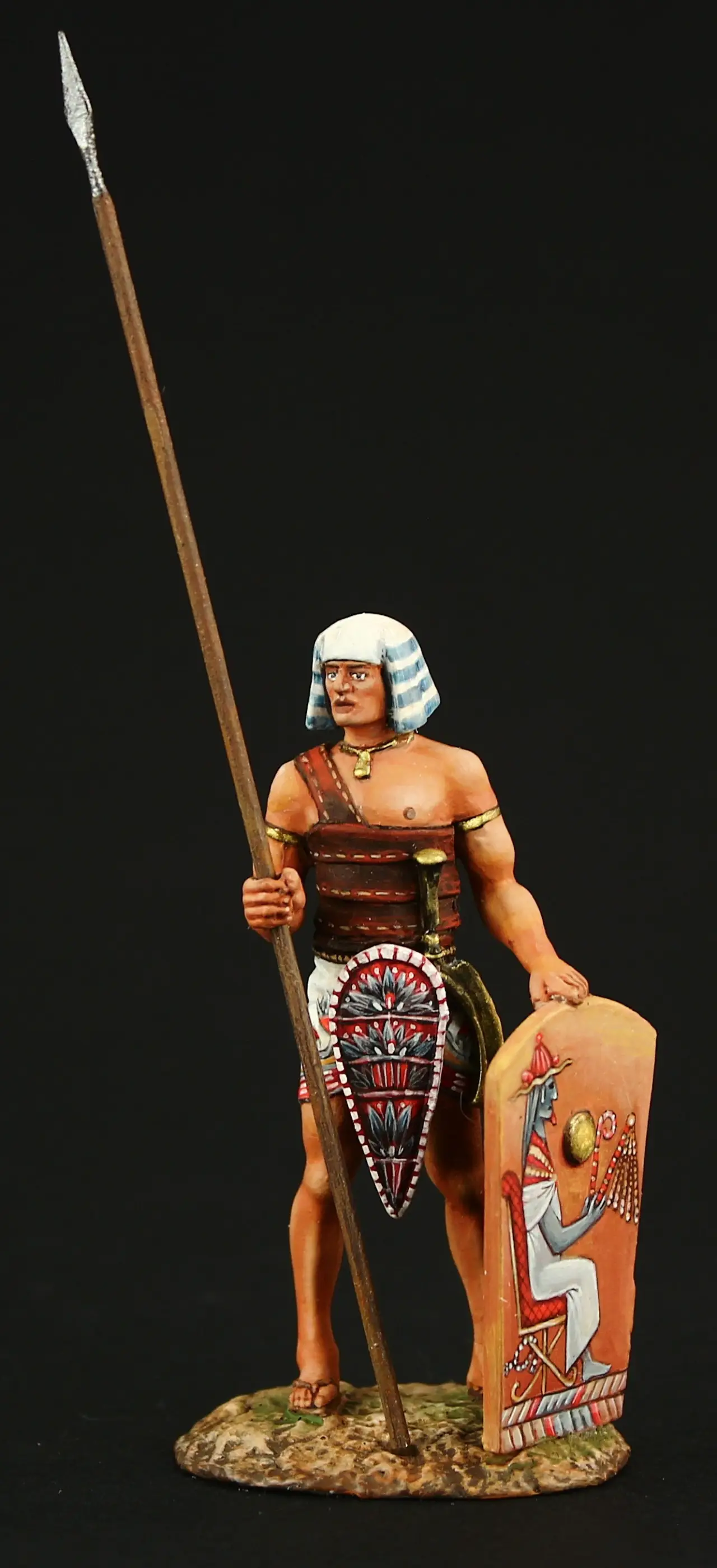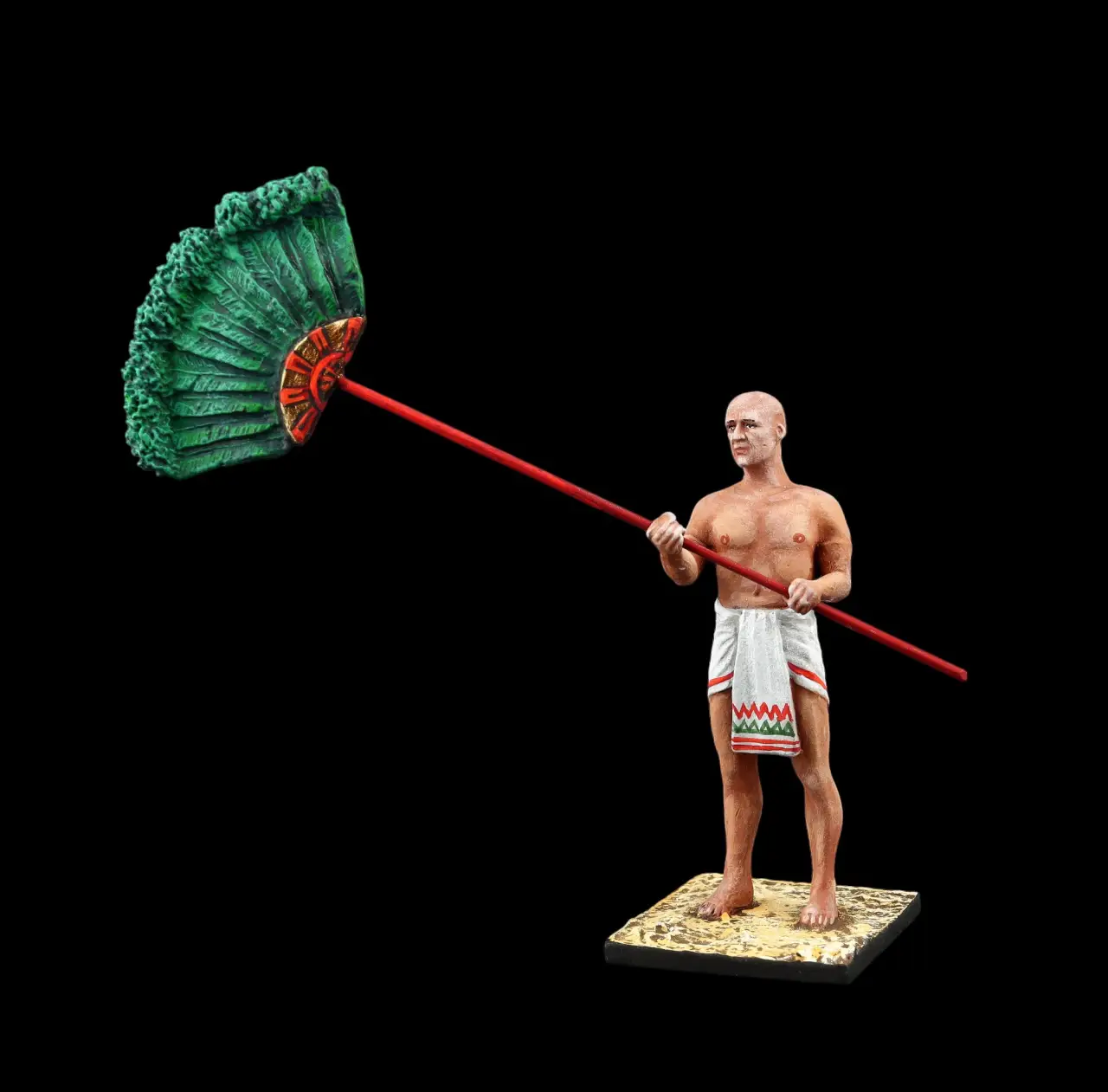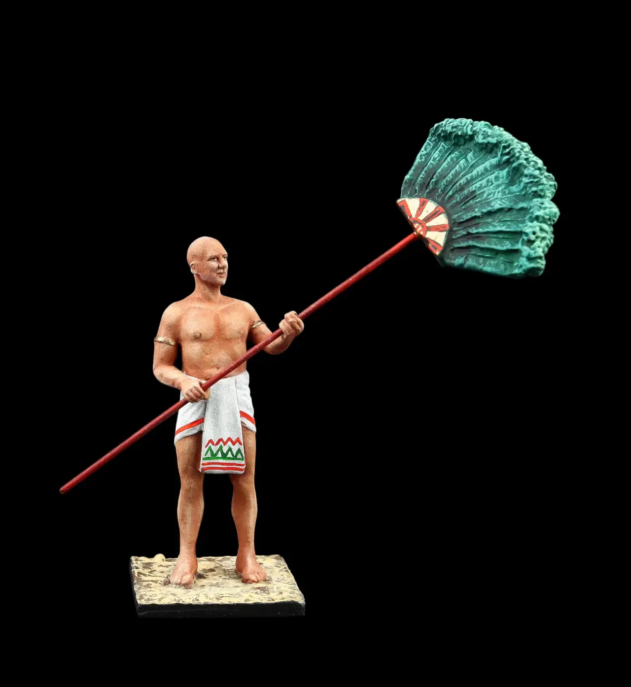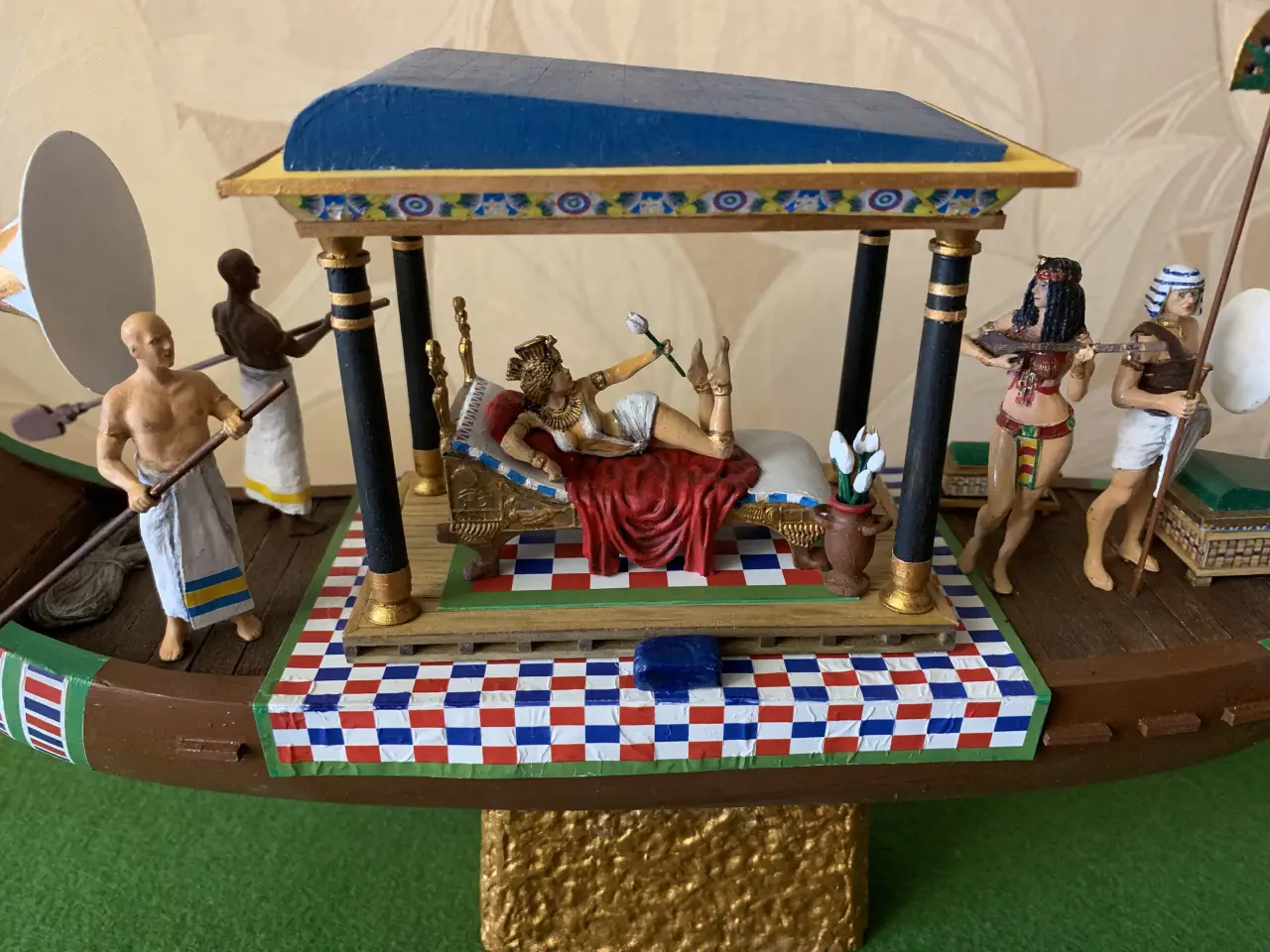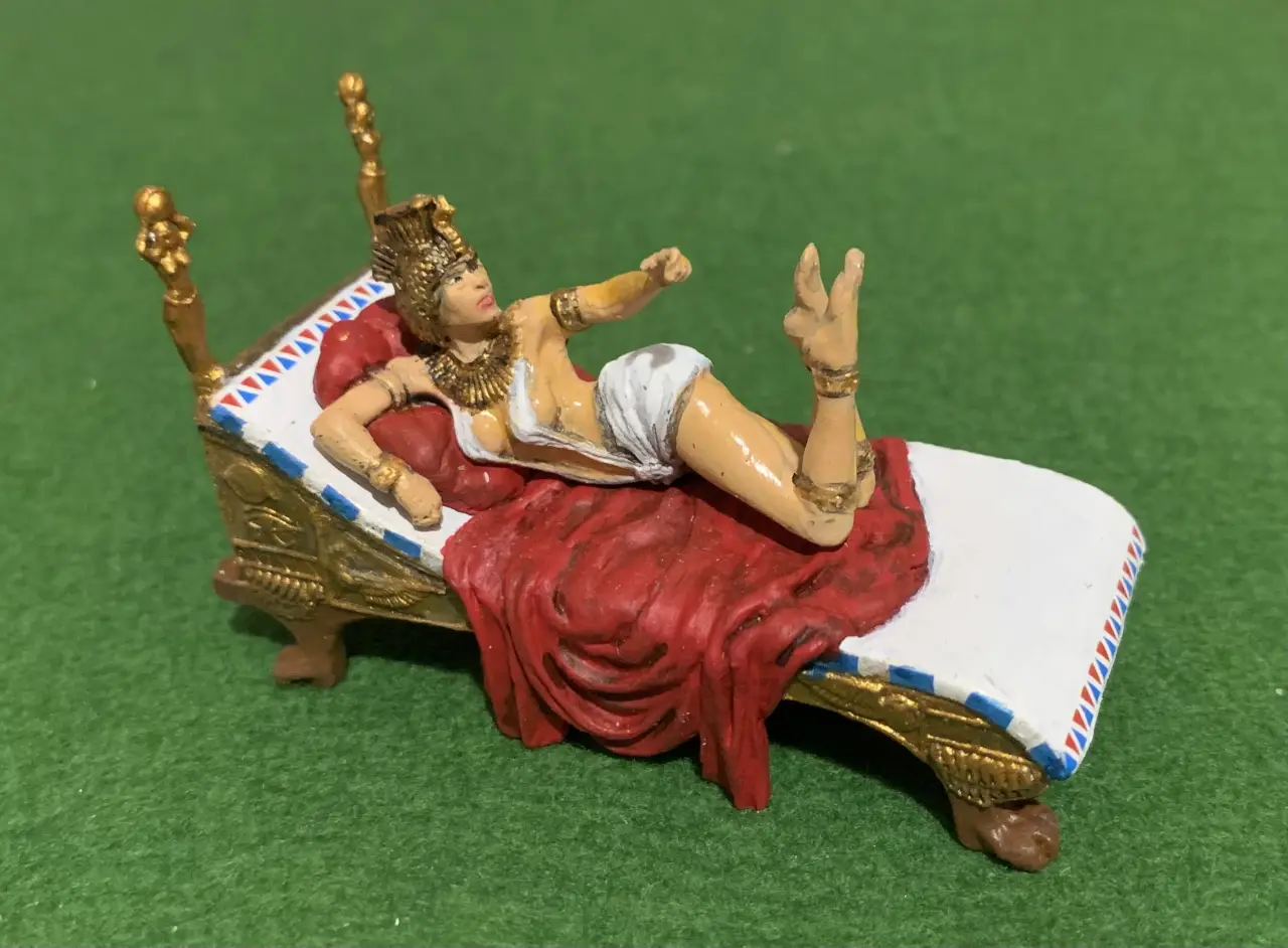 Фигурки эти были выбраны за их максимальное соответствие задуманному, однако их пришлось немного переделать. Так, воин лишался щита и копья, опахалоносцам поменяли наклон рук, рассверлили в них отверстия под весла. А еще, это уже я сам делал, пришлось поменять на них набедренные повязки на длинные «юбки» из… туалетной бумаги и японской модельной шпаклевки. У царицы Клеопатры я попросил удалить с руки змею, а также у всех фигурок подставки из-под ног убрать, заменив металлическими штырьками. Раскрашивал фигурки, понятно, я уже сам…