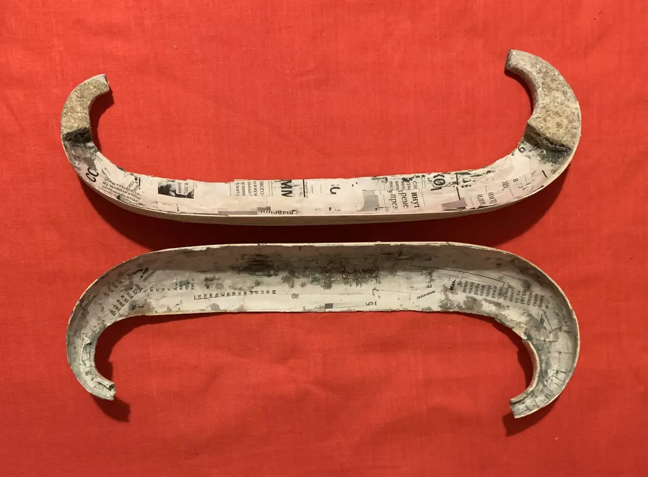 Затем оклеен тремя слоями газетной бумаги: первый слой на воде, два последних на клею ПВА...