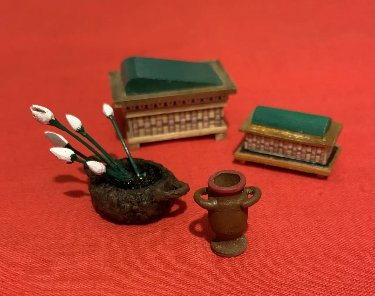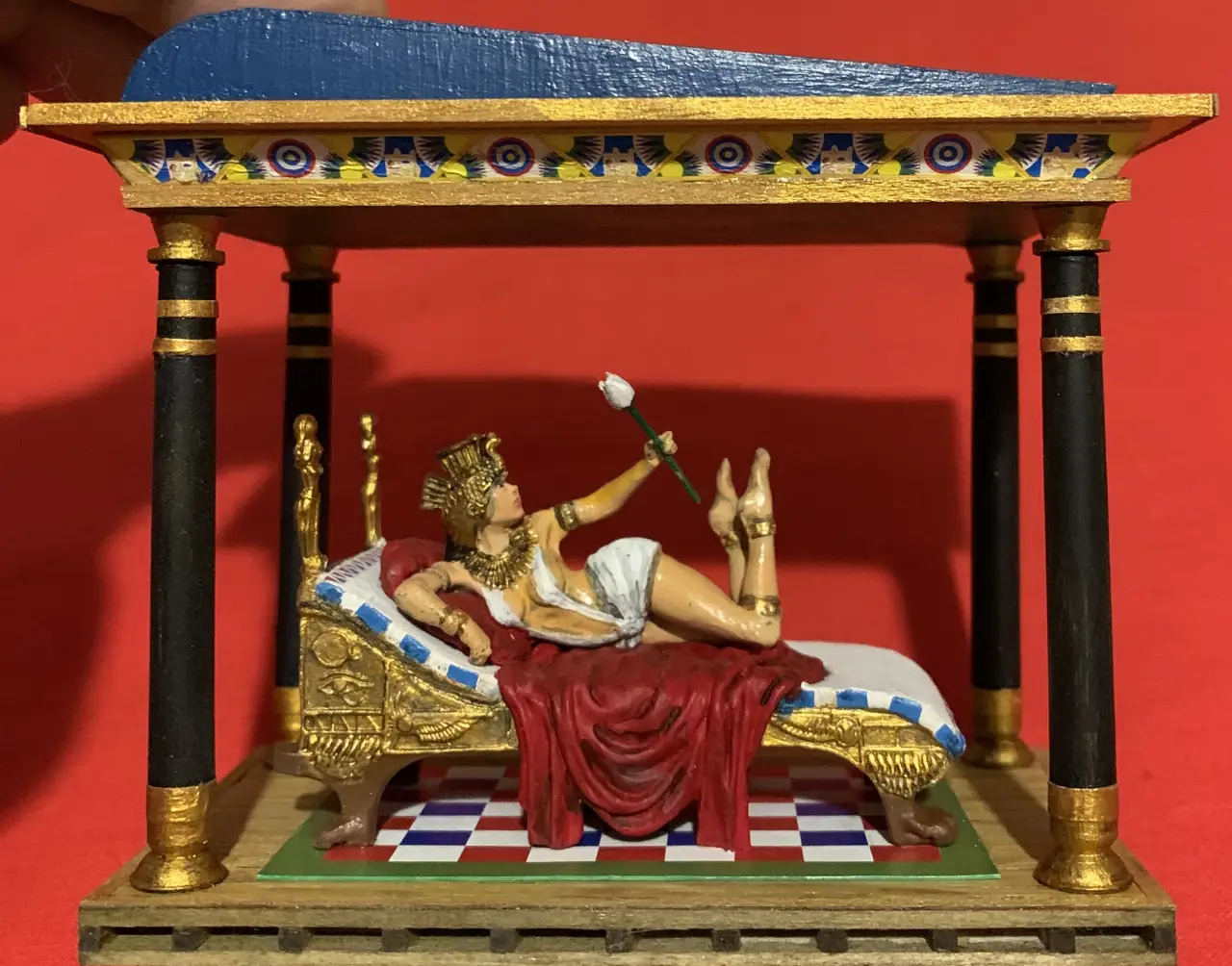 Оказалось, что цветы в корзине на палубе лодки не смотрятся, так же, как и пустой кувшин. Пришлось корзину убрать, а цветы поставить в кувшин рядом с ложем царицы. Кувшин я, кстати, сделал из ручки от засохшей кисточки, используя в качестве токарного станка обычную дрель-шуруповерт, а вот обрабатывался «кувшин» при помощи надфилей. Ручки были сделаны из толстой медной проволоки