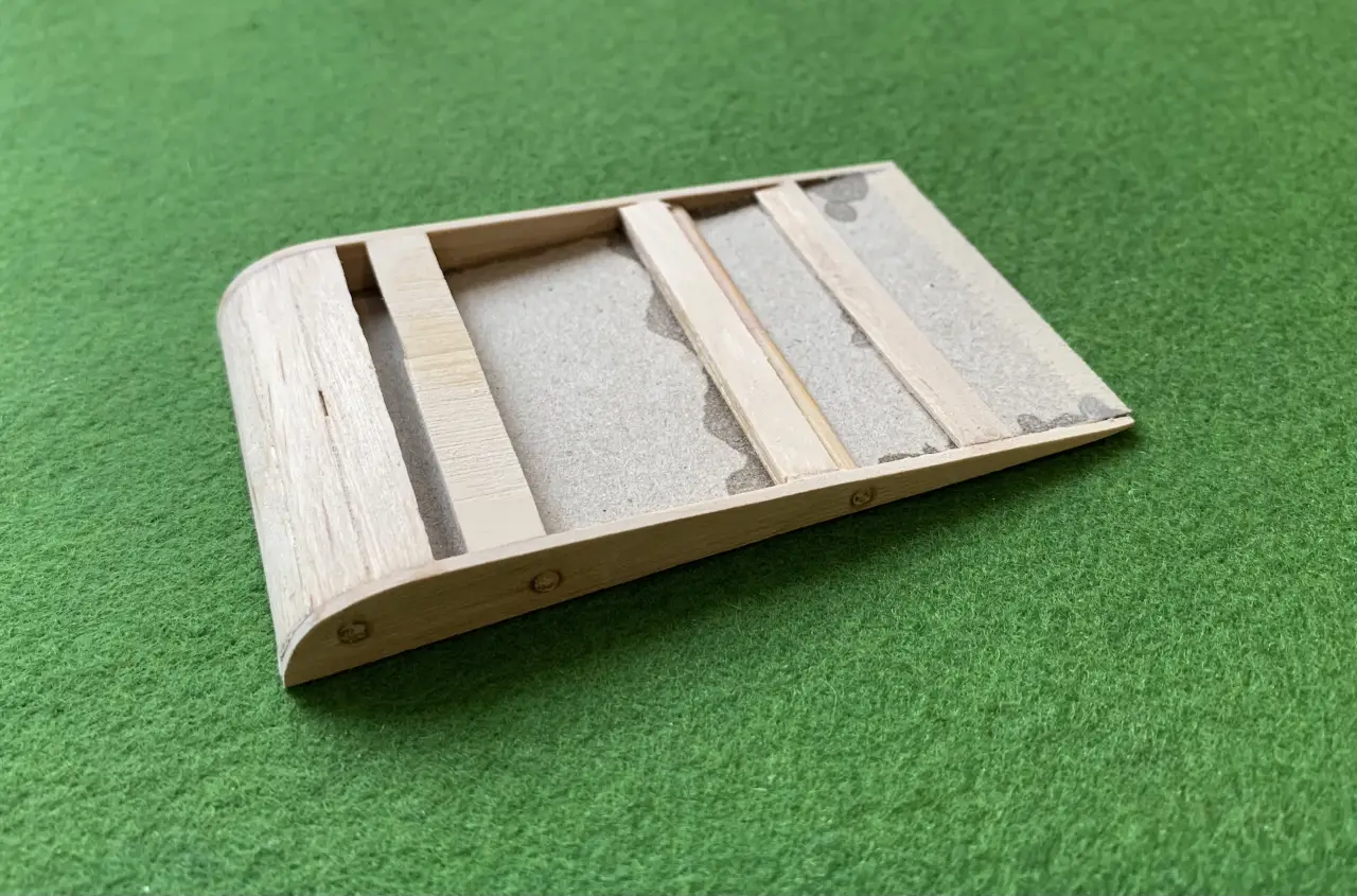 Все неровности и изогнутые части корпуса покрывались смесь опилок с суперклеем, что придало корпусу просто исключительную прочность. Ну, а затем поверхность корпуса была обработана наждачной бумагой, наклеенной на деревянную основу