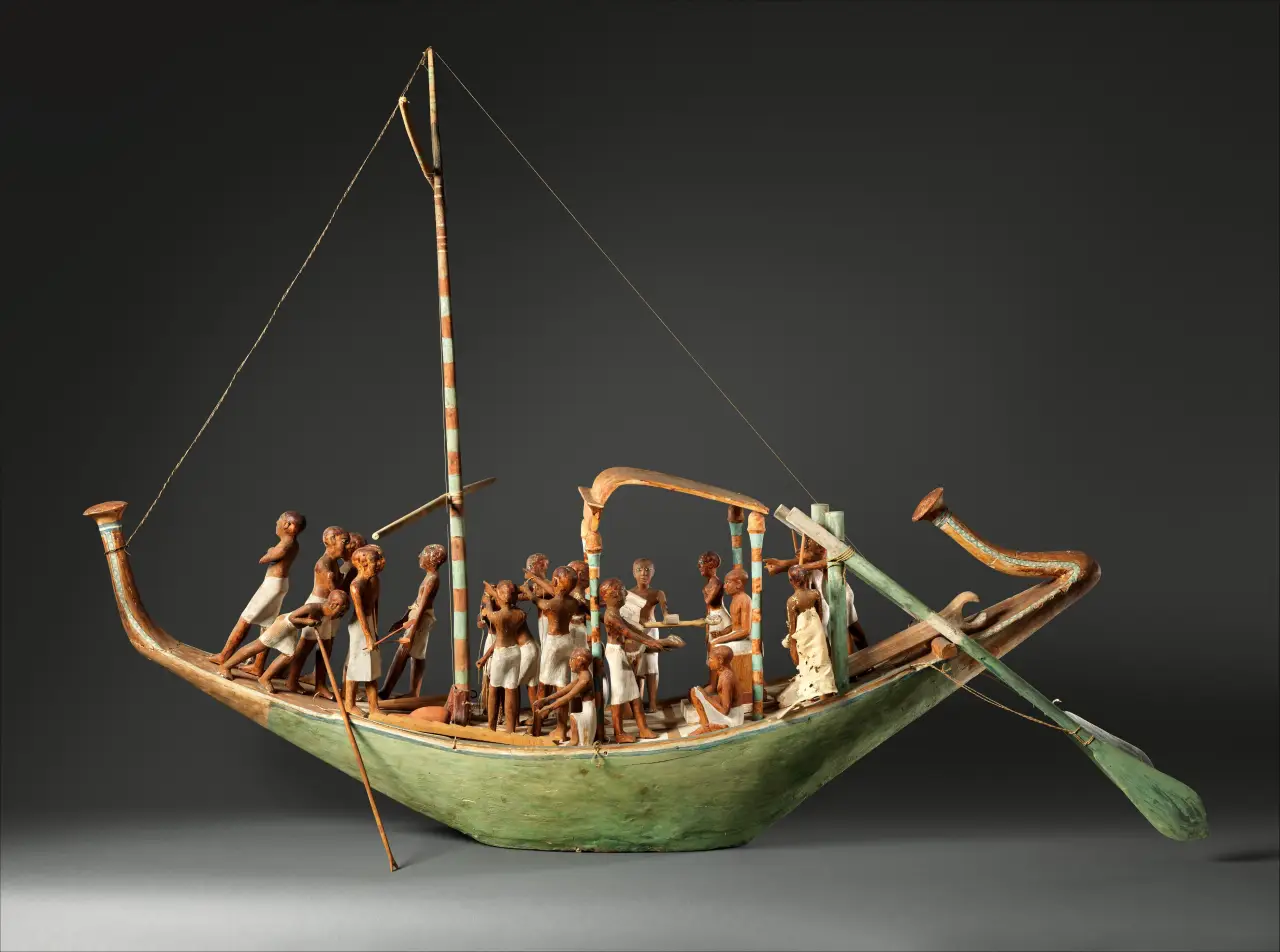 Модель нильской ладьи. Среднее царство, XII династия. Начало эпохи правления Аменемхета I, ок. 1981-1975 гг. до н.э. Верхний Египет, Фивы, Южный Асасиф, Гробница Мекетре (TT 280, MMA 1101), раскопки MMA, 1920 г. Материалы: Дерево, краска, штукатурка, льняной шпагат, льняная ткань. Размеры: длина 145 см, с рулем 158 см, высота с мачтой 81 см, ширина 53,4 см. Метрополитен-музей, Нью-Йорк
