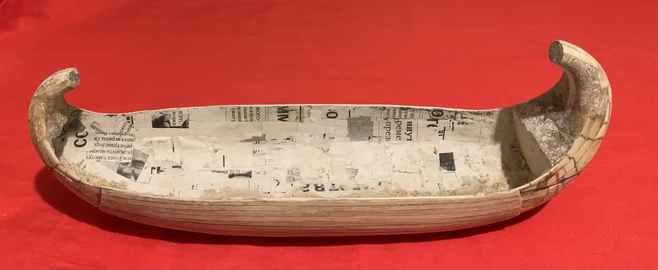 Половинки корпуса были склеены и оклеены «досками» из ольховых реек шириной 3 мм