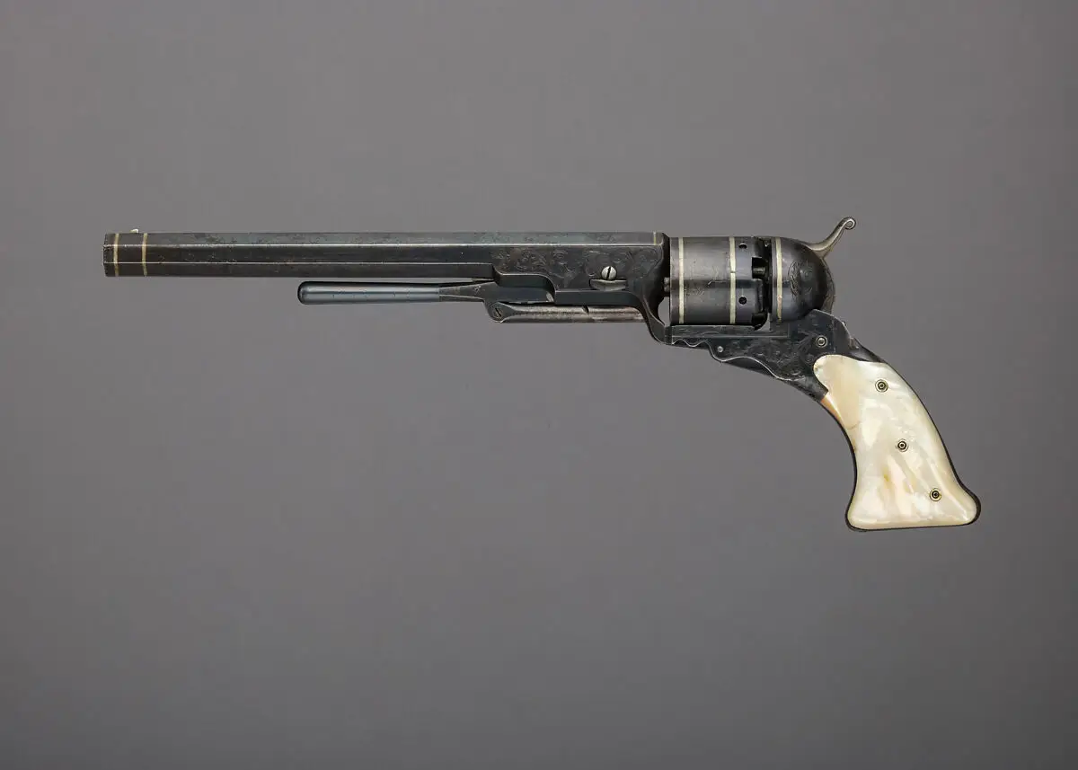 14. «Кольт-Патерсон» частый гость в статьях про револьверы Сэмюэля Кольта, но вот фото такого «Патерсона» встречаются редко. Это «Патерсон» № 3. Выпуск 1838 г. Производство в Патерсоне, Нью-Джерси. Материалы: сталь, серебро, перламутр. Длина 42,55 см. Длина ствола 30,48 см. Калибр 10,2 мм