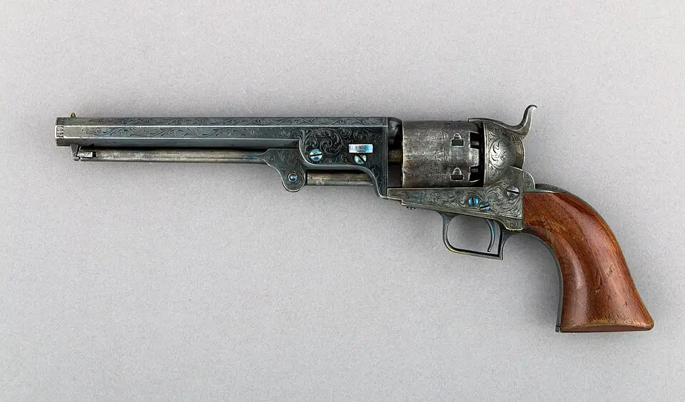 5. «Кольт-Драгун», 1852 года выпуска, производство – Хартфорд, Конектикут. Материалы: сталь, латунь, серебро, древесина ореха. Длина 35,56 см, длина ствола 19,05 см, калибр 11 мм