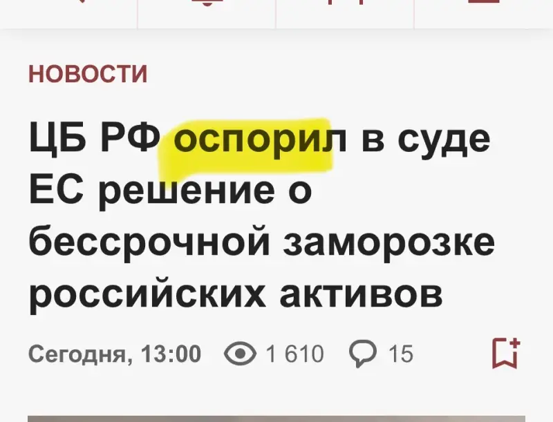 Теперь ЦБ РФ делает следующий шаг. Пресс-служба регулятора сообщает, что Банк России подал в Общий суд Евросоюза в Люксембурге заявление (иск), в котором оспаривает регламент, установивший заморозку российских активов. В иске ЦБ указано, что решение ЕС нарушает «базовые и неотъемлемые права на доступ к правосудию, неприкосновенность собственности, принцип суверенного иммунитета государств и их центральных банков», а также противоречит «фундаментальным принципам права».