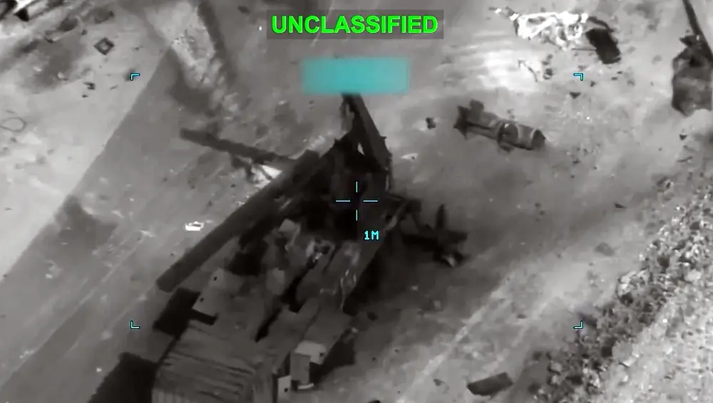 Далее американские военные зачем-то нанесли удар по остову ранее уничтоженной пусковой установки баллистических ракет. На кадрах очень хорошо видно, что никакой ремонт ей уже не поможет, повторное применение ПУ исключено. Даже автоматическая система распознавания целей пишет четко: «Unclassified» («неклассифицированный»).