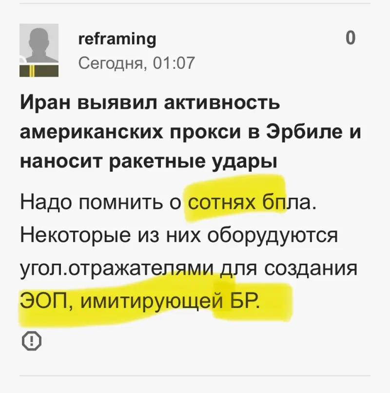 Поступают сообщения о том, что американские военные одну иранскую ракету сбили, а две других ударили по базе. Предварительно ПВО армии США в Эрбиле была существенно обескровлена беспилотниками, часть которых, по последним сведениям, запускалась с территории самого Ирака. Поступает информация о «200-х» и «300-х» как среди американских военных, так и среди прокси. Горит военная техника, в том числе и та, которая могла бы использоваться для наземной операции в ИРИ.