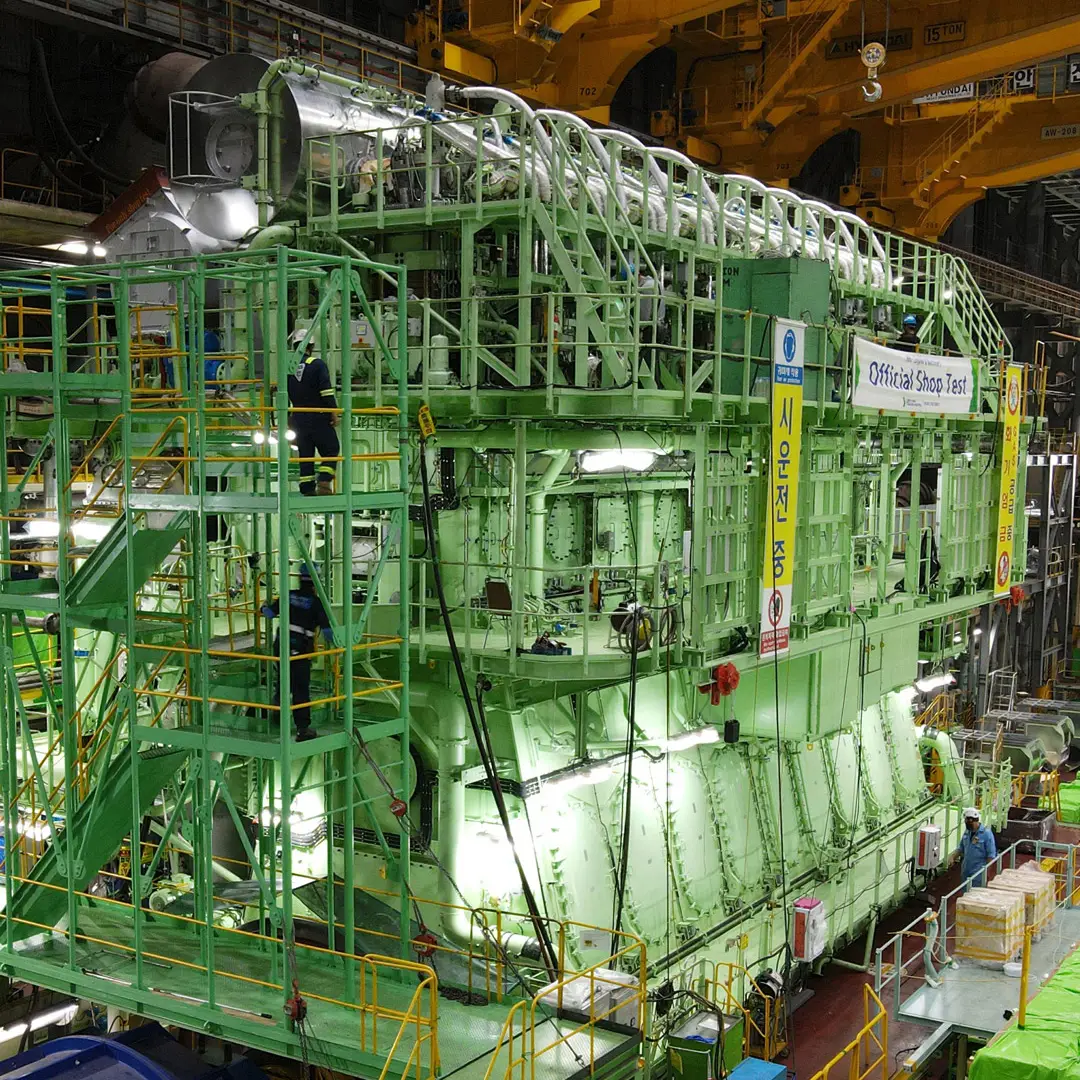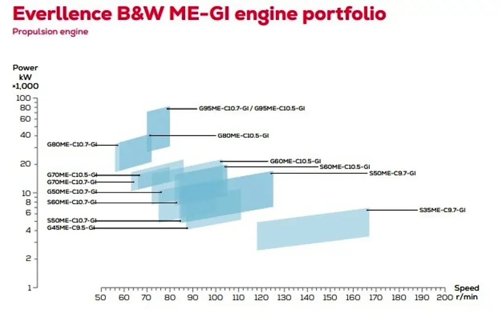 • Сжиженный этан (LEG – Liquefied Ethane Gas). Легко доступен, хранится при криогенных температурах (ниже -100 °C), но требует менее толстой изоляции танков, чем СПГ, из-за более высокой температуры кипения. Снижает выбросы оксидов серы (SOx), азота (NOx) и углекислого газа (CO2) по сравнению с традиционным тяжелым мазутом (HFO) и судовым дизельным топливом (MDO). Пример – линейка двухтактных малооборотных дизелей Everllence B&W ME-GIE (ранее MAN B&W ME-GIE). Мощность 8300-29 120 кВт при 62-127 об/мин.