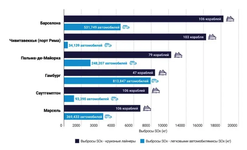 Сравнение выбросов SOх с круизных судов и автомобилей в европейских портах